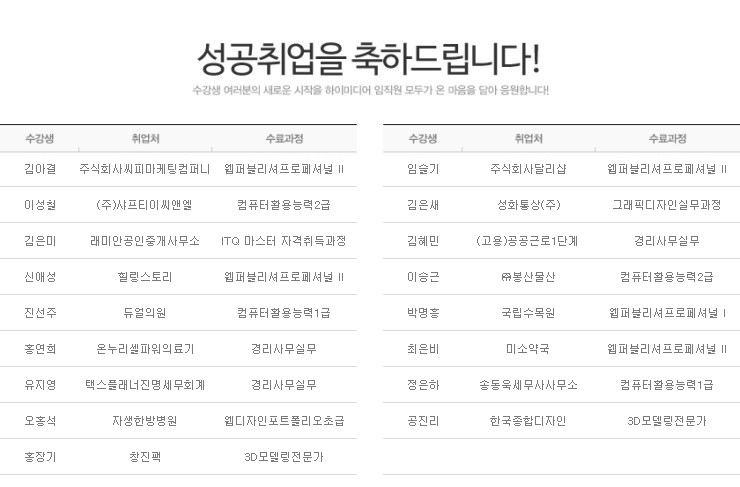 하이미디어컴퓨터학원 노원캠퍼스 2015년 2월 성공취업자 명단입니다.
