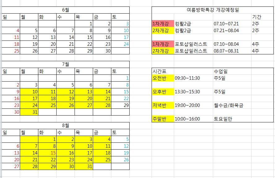 7,8월 여름방학 특강 일정입니다.